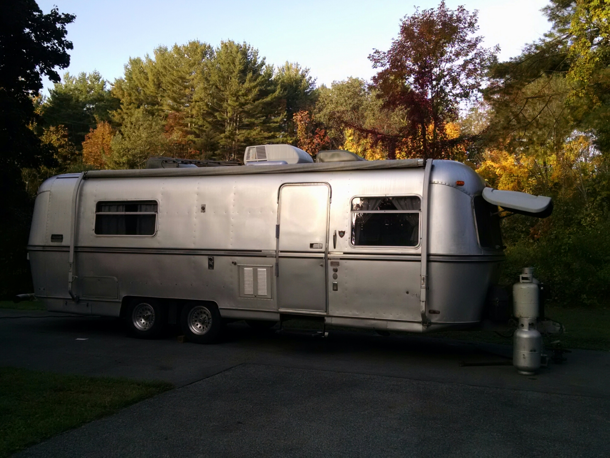 Anyway, the sheen and color of the anodized aluminum of the Avions reminded my husband Kevin and I of my pewter…and well calling a living space that is less than 30 feet long a “palace” is just tongue and cheek fun!  So we had our name for her….now we just had to FIND her!  Needless to say the Travelcade was far more a project then we wanted. So the search of Craigslists from all over the USA, a tracking of http://www.RVtrader.com and even “looking for” postings on our personal FB pages finally paid off. We found our coach in the VT Craigslist on a Thursday morning, got out of work that day-drove 2.5 hours into the dark to see her.  Used car headlights and flashlights to scope the exterior. Thankfully the owner could plug the power cord into his adjacent garage so an interior inspection was much easier. We loved her! She was in really nice shape save a few tweaks and had been consistently used which is far better than those left abandoned in fields and backyards.  The owner accepted our offer and deposit and we drove back home another 2.5 hours that same night. This return home trip was filled with excited chatter and seemed to fly.  To top it off, the owner even volunteered to deliver her to our door!