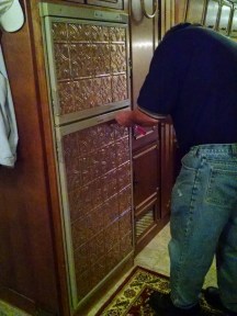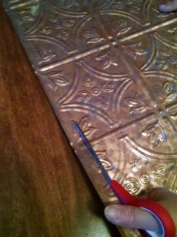 Do we had one 2’x2′ repro vinyl “tin” ceiling tile in the “Cracked Copper” finish that we wanted to try in place of the black plexiglass panels. We had this one panel already because we had bought a few different ones to try in our old Class A RV as a protective backsplash in our kitchen/stove area