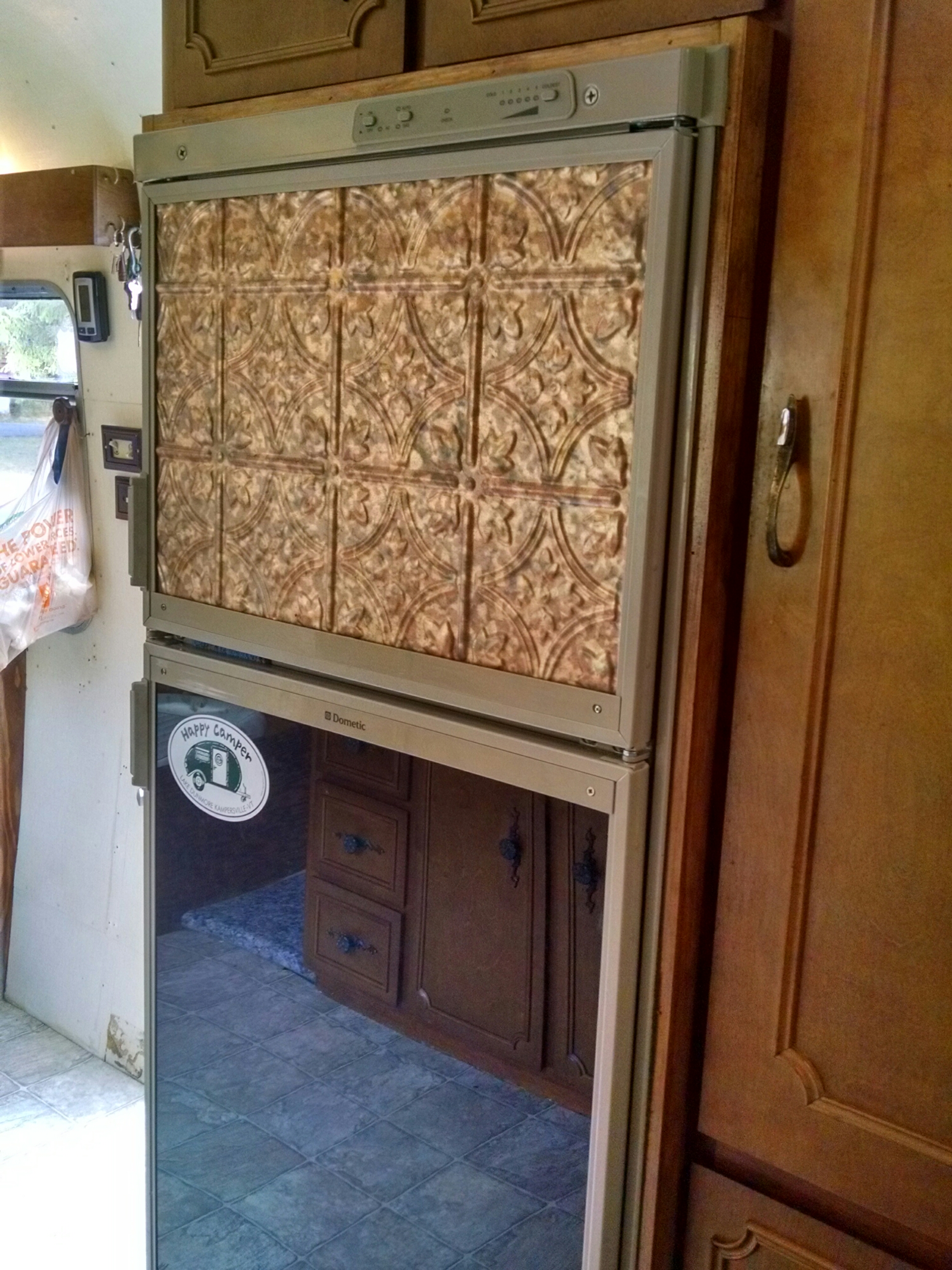 Oct. 22, 2016. We were not thrilled with the black plexiglass, sticker laden refrig panels that the previous owner had. Granted we were impressed with how much and far they had traveled ND, FL, CA, ME but it just seemed so “in your face” and not us.