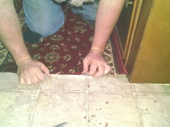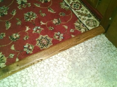 Below the thresholds are being screwed down You want to be sure you grab enough of the carpet to keep it secured. Our entire dining and kitchen area subfloor and vinyl had been replaced in last six yrs with 3/4″ marine plywood so our carpet and kitchen vinyl is now even. It was not before. Here is bathroom transition.