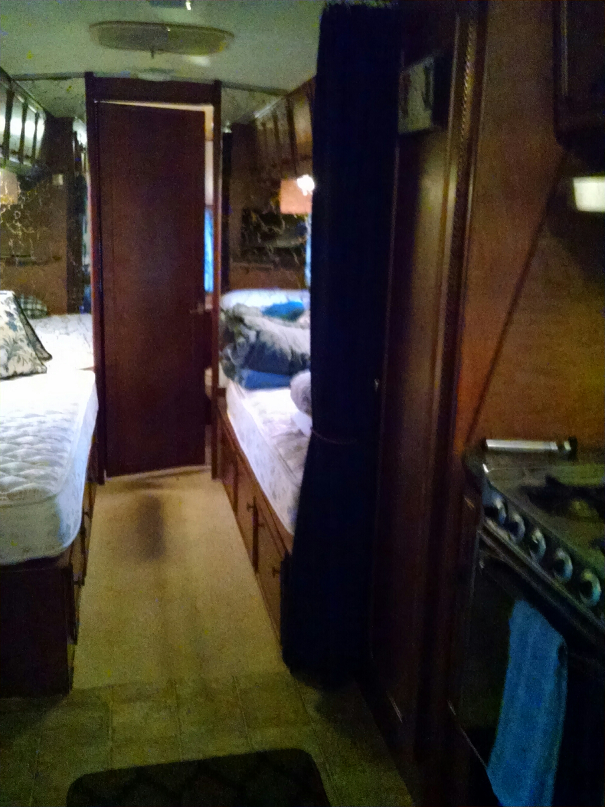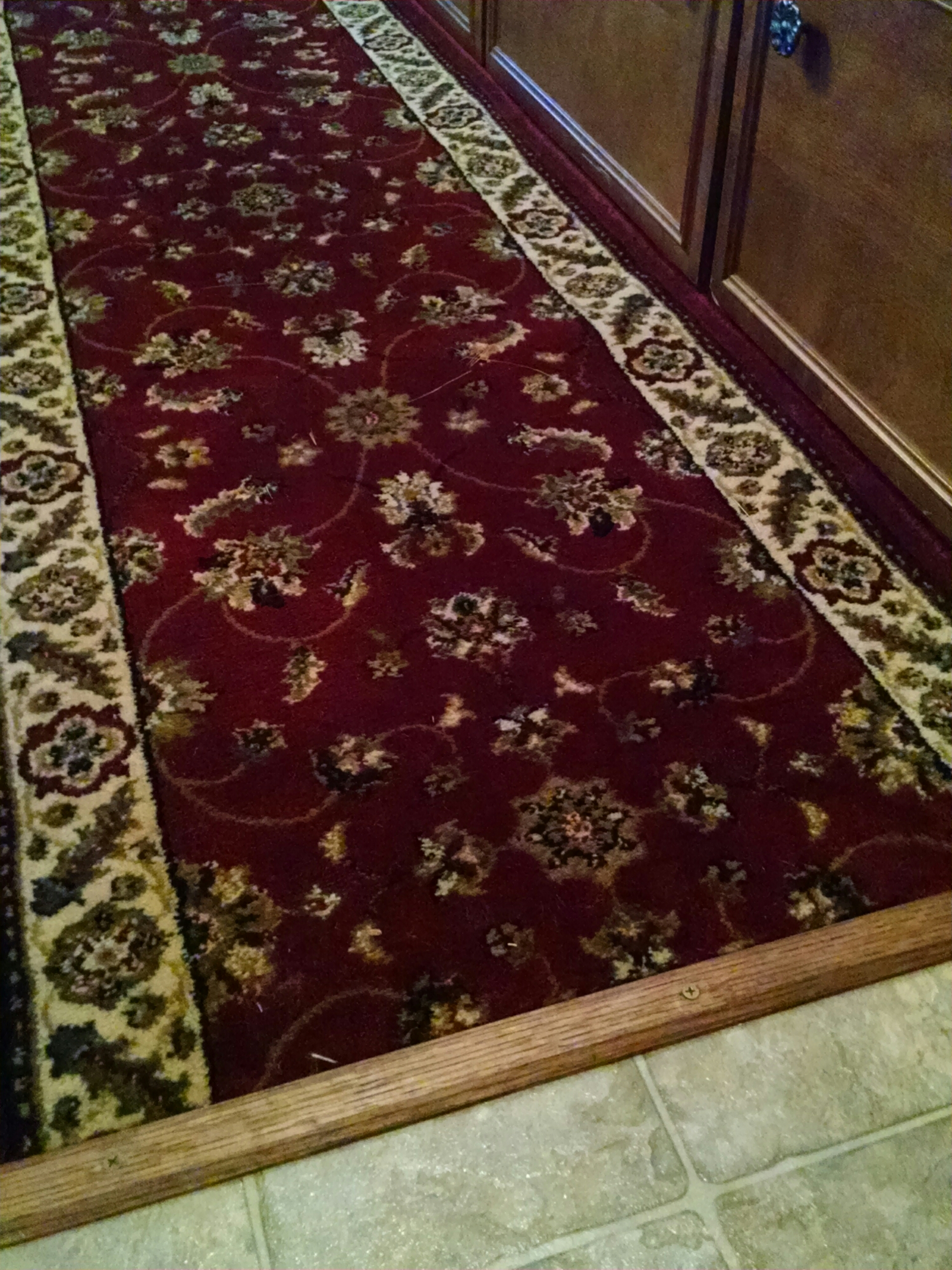 Oct 22, 2016. Our coach originally came with an off white sheet vinyl with gold veining.(guess they wanted to match the jazzy mirrors with gold veining which we actually adore!) However the vinyl is a bit tired and having a cozy carpet to step on in the early morning wake up is really welcomed. So we decided to do a carpet facelift. The previous owner can cut and fitted an off-white Berber rug remnant in place. It was in decent shape and clean. What you see are just shadows. But the transition from kitchen to rug was never completed with any threshold etc. And you also had to be careful not to catch or chip the raw vinyl edge.