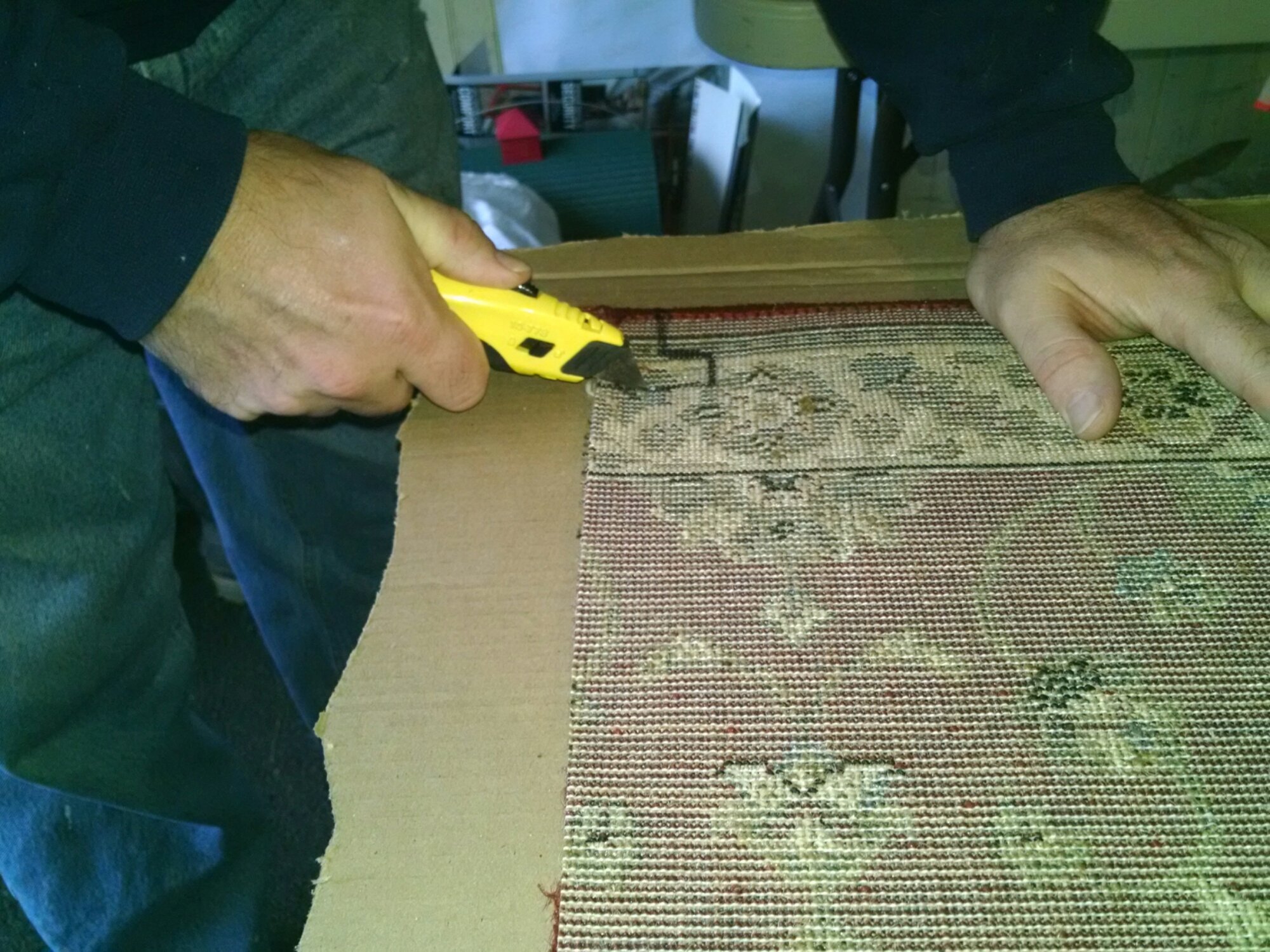 The new Carpet was cut first with a box cutter. (Could not find our carpet cutter). Then little final trims retire able to be done in coach with sturdy household scissors which gave us more control for tiny slices to ensure perfect fit at doorway. I also recommend leaving any of the edge building threads long. Wrap them to the back of your new carpet and tape them down with gorilla tape. This prevents any short traveled threads from. Showing or eventually popping loose and showing on the top side.