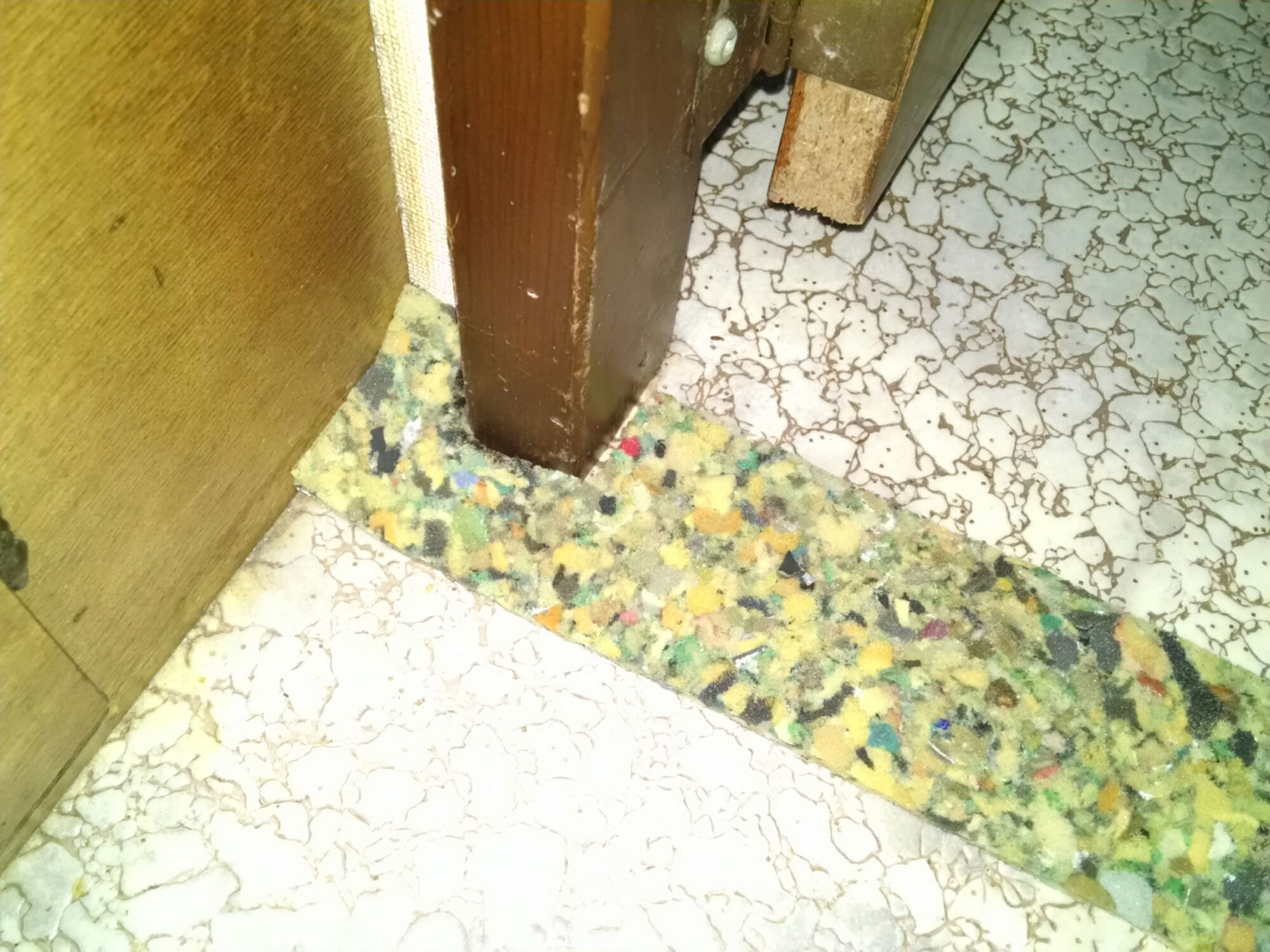 Below is carpet pad being trimmed and pieced to fit. Note orig gold veined Vinyl flooring. Not bad for 44 yrs old!