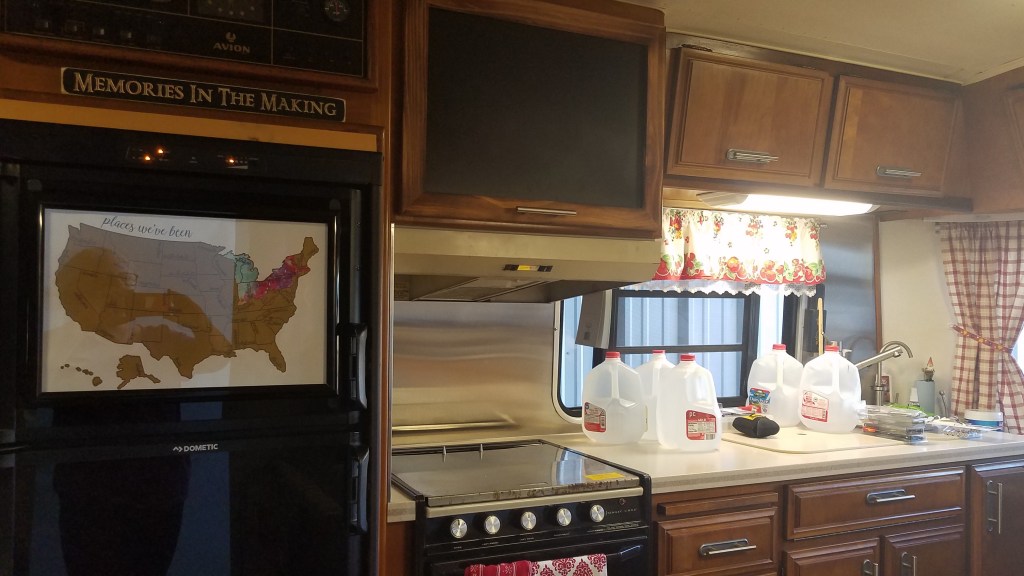 This same trend continued when we bought our 1987, 32 foot, S model Avion just as the Covid-19 pandemic was hitting in March 2020. She was delivered to us in April, by June the original huge, heavy clunker microwave was on the trash heap. The cabinet that once held it now has been usefully repurposed to hold kitchen contraptions I DO USE…my Instapot, my small sized air fryer, my mini Belgian waffle maker…and then a felt bin that holds batteries, quick little tool box and my sewing box. It will probably hold my portable sewing machine for the first few years of our full timing…cause I just wont be able to part with it yet! LOL