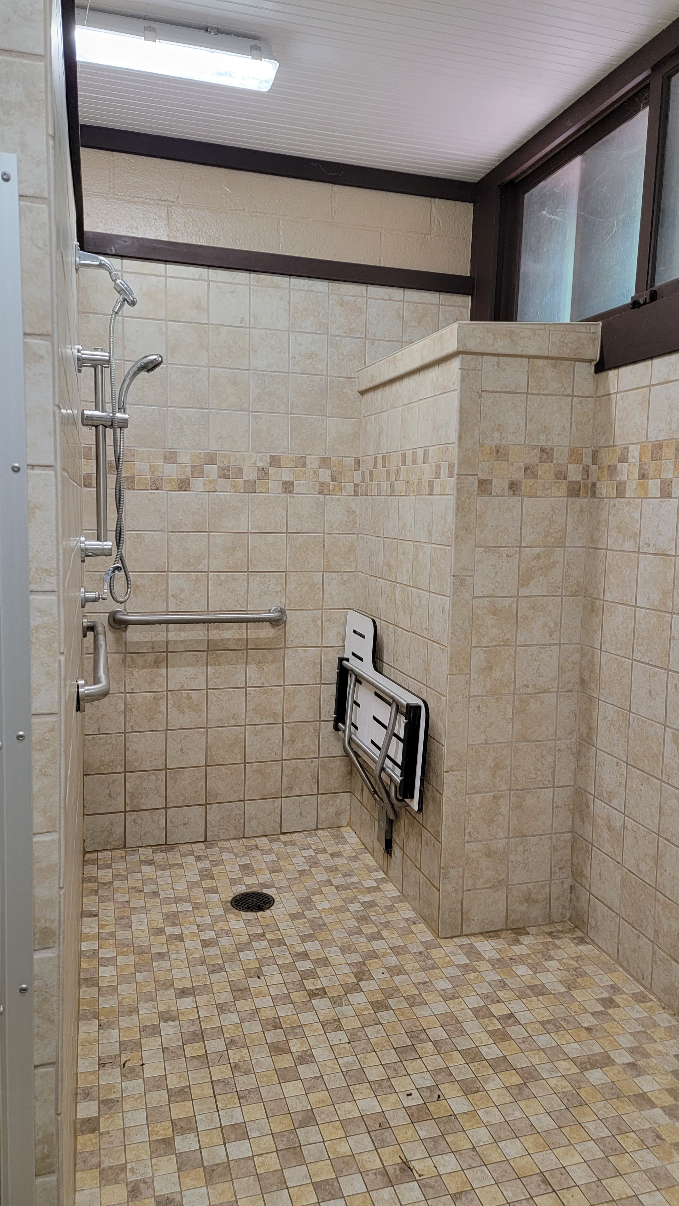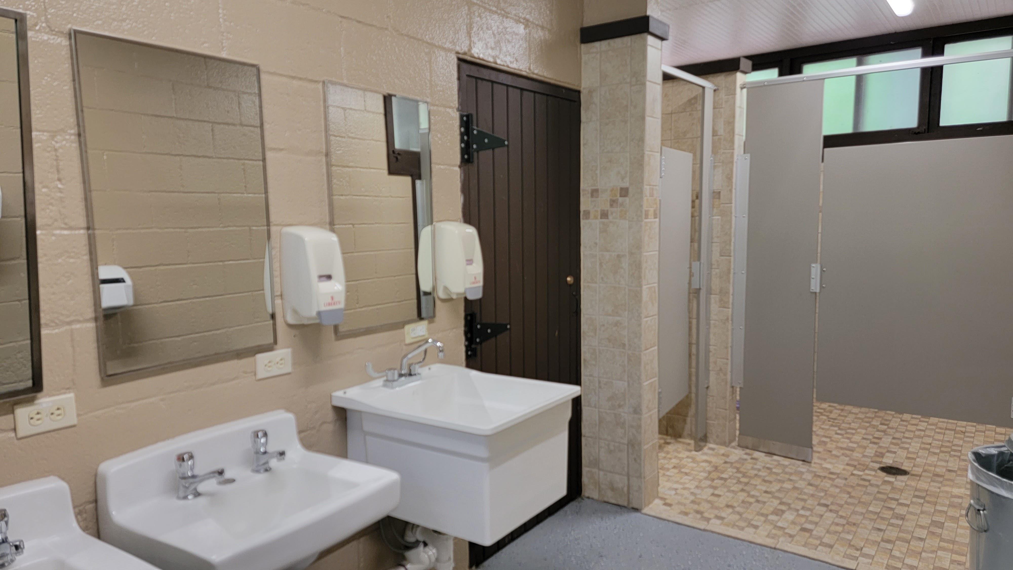 CAMPGROUND BATH HOUSES: Each campground loop has bathroom facilities. The bath houses in the two electric loops: Cayuga and Mohawk appear newer and were in very good repair and clean. We wish they had put the large tub sink outside like at other state campgrounds though. It is inside and with no shelves for doing dishes, folks tend to use all of the shelving and other sinks-hogging a bit. The handicap shower is best to use since has some hooks and fold down bench to sit, otherwise, plan to bring your own stool or bench to set your towel, toiletries and garments on. It was a little bit of a walk from our site to the bath house. There is a dumpster near bath house and also another behind the main entry ranger booth which was closer to our site. The bath house below was in our Cayuga Loop.