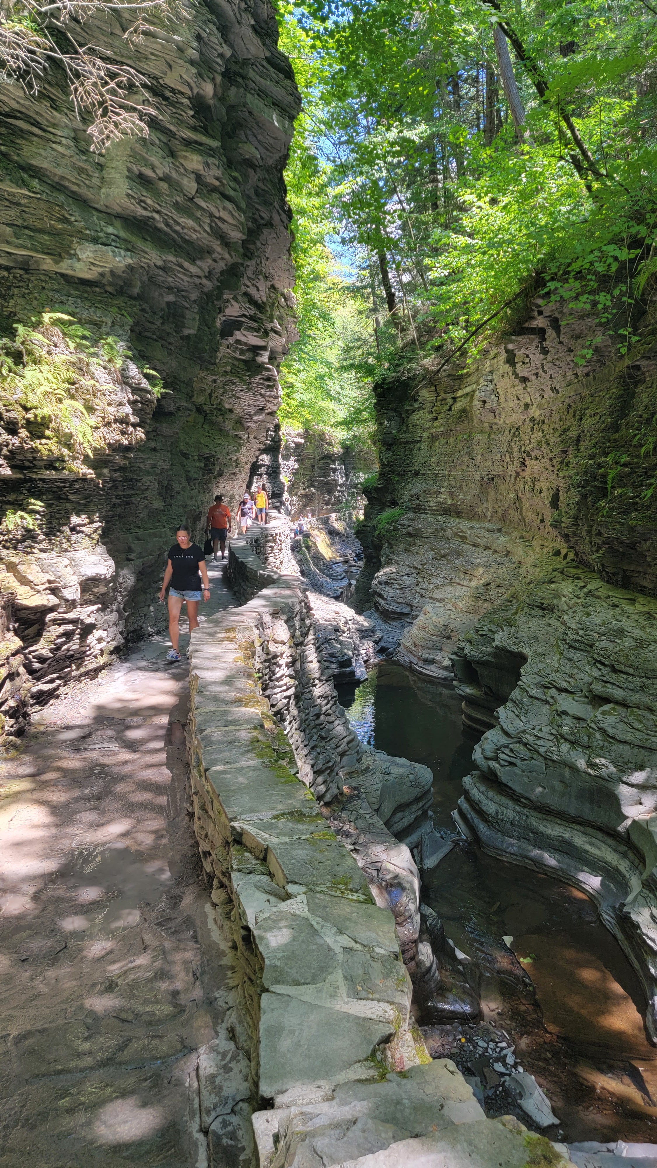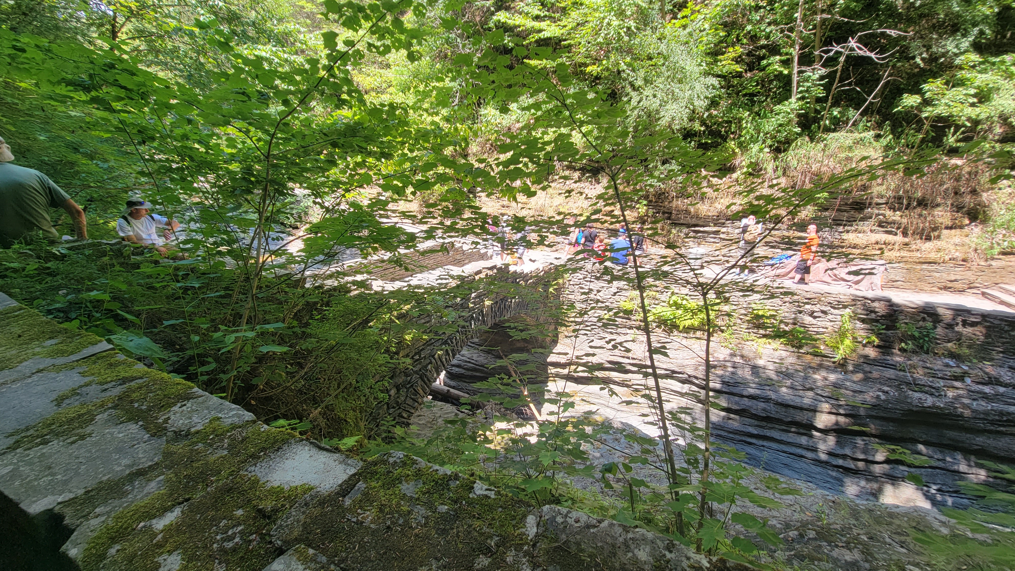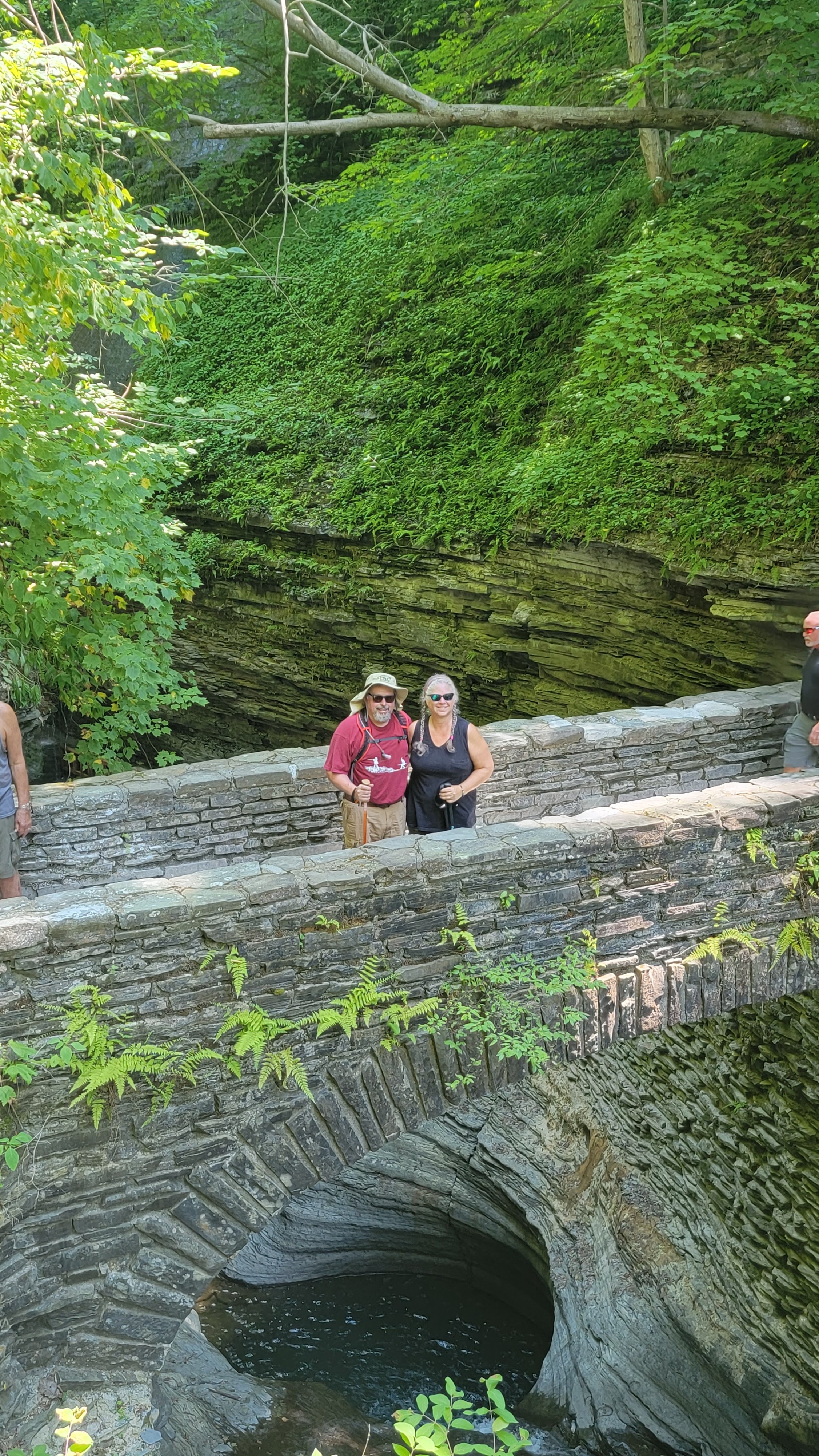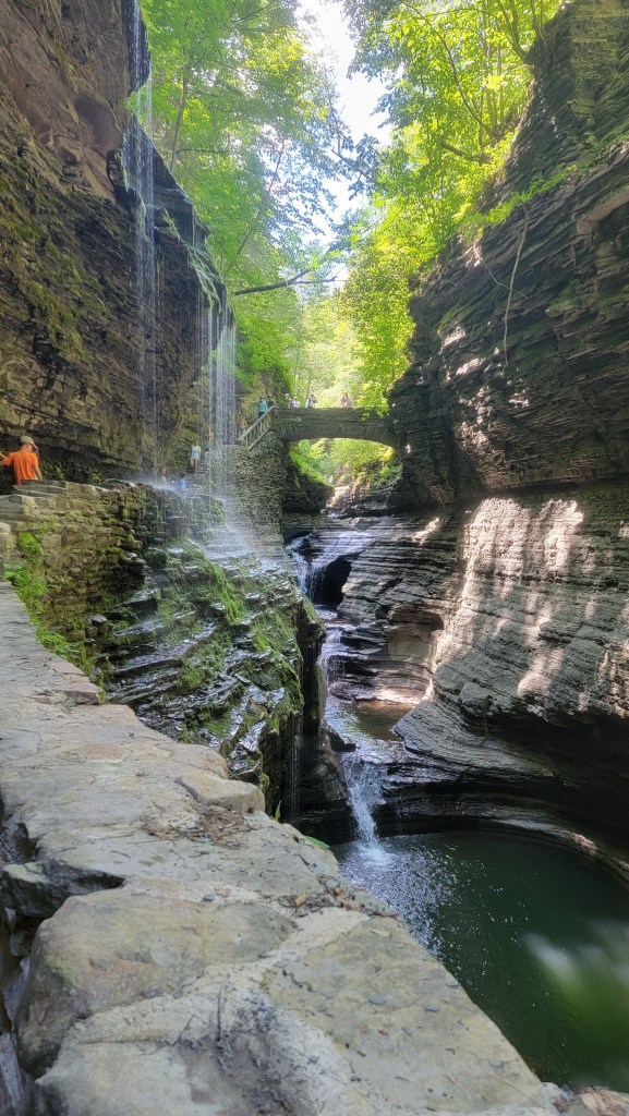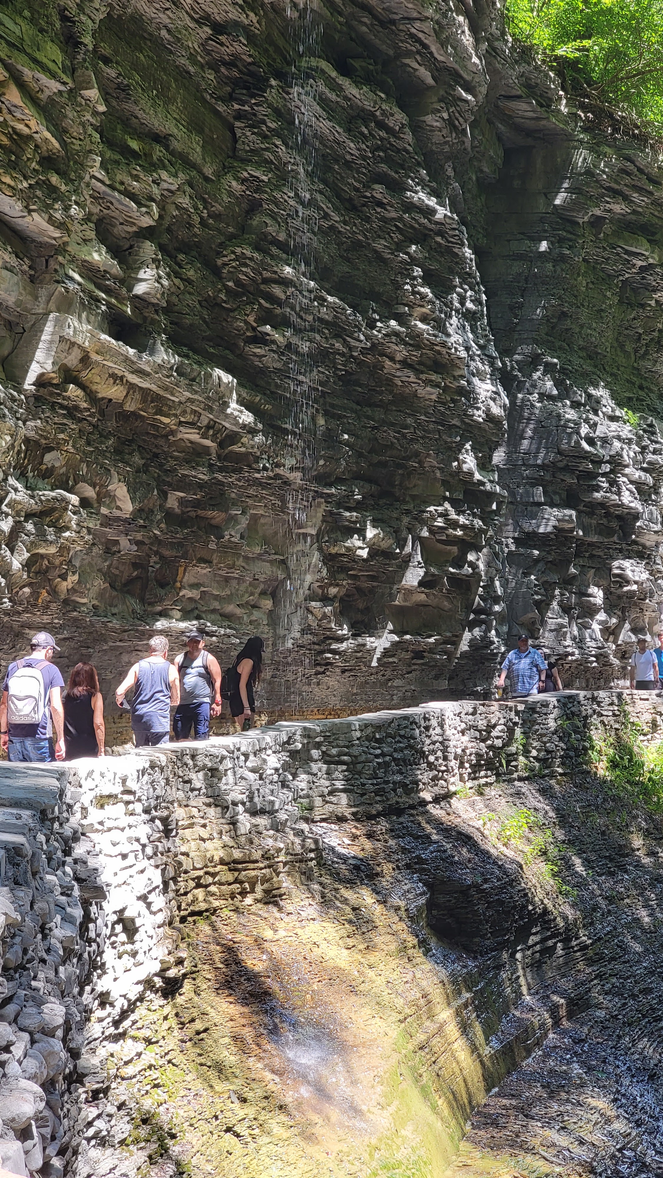 THE GORGE IS GORGEOUS! This is the reason you come right?? yes! This gorge and its waterfalls (some you can walk behind) is dubbed the “Grand Canyon of the East” and aptly so! It is beautiful from so many angles as you traverse the stone staircases, walk over stone bridges and navigate through some cut winding grottos with staircases (one forged in 1908!) We were here in mid-July and to be honest, the water levels were fairly low so some of the waterfalls were not as grand as they would have been in late spring. NOTE- sometimes the trail is closed if water levels are too high so double check their website for alerts. Nevertheless, being there on a sultry July day we enjoyed the cool misty atmosphere of the gorge itself. Temps dropped easily by 20 degrees and the mist from some areas was a welcomed surreal bath. I am sure the gorge in the fall is beautiful but note, much of it is rock so to see fall foliage you are going to need to be looking up more than around. Do only wear closed, sturdy shoes! The steps are stone, wet and uneven at times. We wore our hiking shoes and were just fine. There are several staircases that shoot off and up to the top edge of the eastern side of the gorge. We did not take any of these but we understand one leads to an old cemetery with grave markers of original settlers to the area and others lead to other more overarching overlooks of the gorge. These could be fantastic with fall foliage in full swing and give you views of the surrounding lake area of Seneca lake itself.
