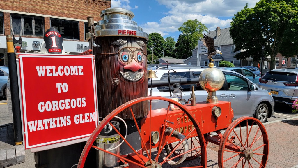 DOWNTOWN WATKINS GLEN: to be sure, this is a tourist town! WG sits at the southern foot of Seneca Lake, one of NY’s famous Finger Lakes. A leisurely drive around the entire lake on the roadways that sit high above on the plateau is worth the time if you have it. There are tons of vineyards and breweries, quaint little towns some with nice boutiques and restaurants (not a lot of gas stations though so plan accordingly). There is a WalMart just to the east edge of downtown- easy in and out with your RV to get grocery, ice, etc.