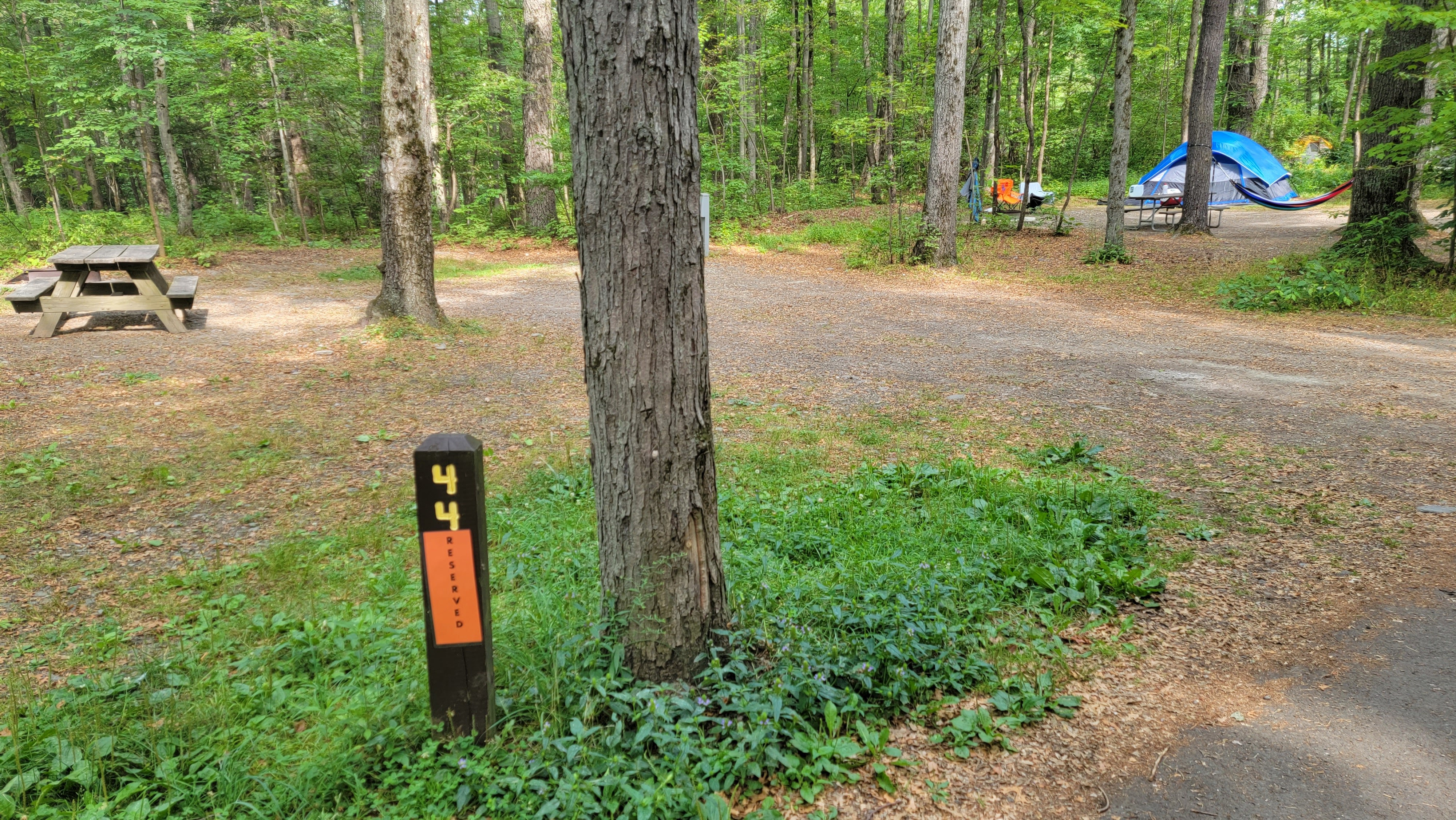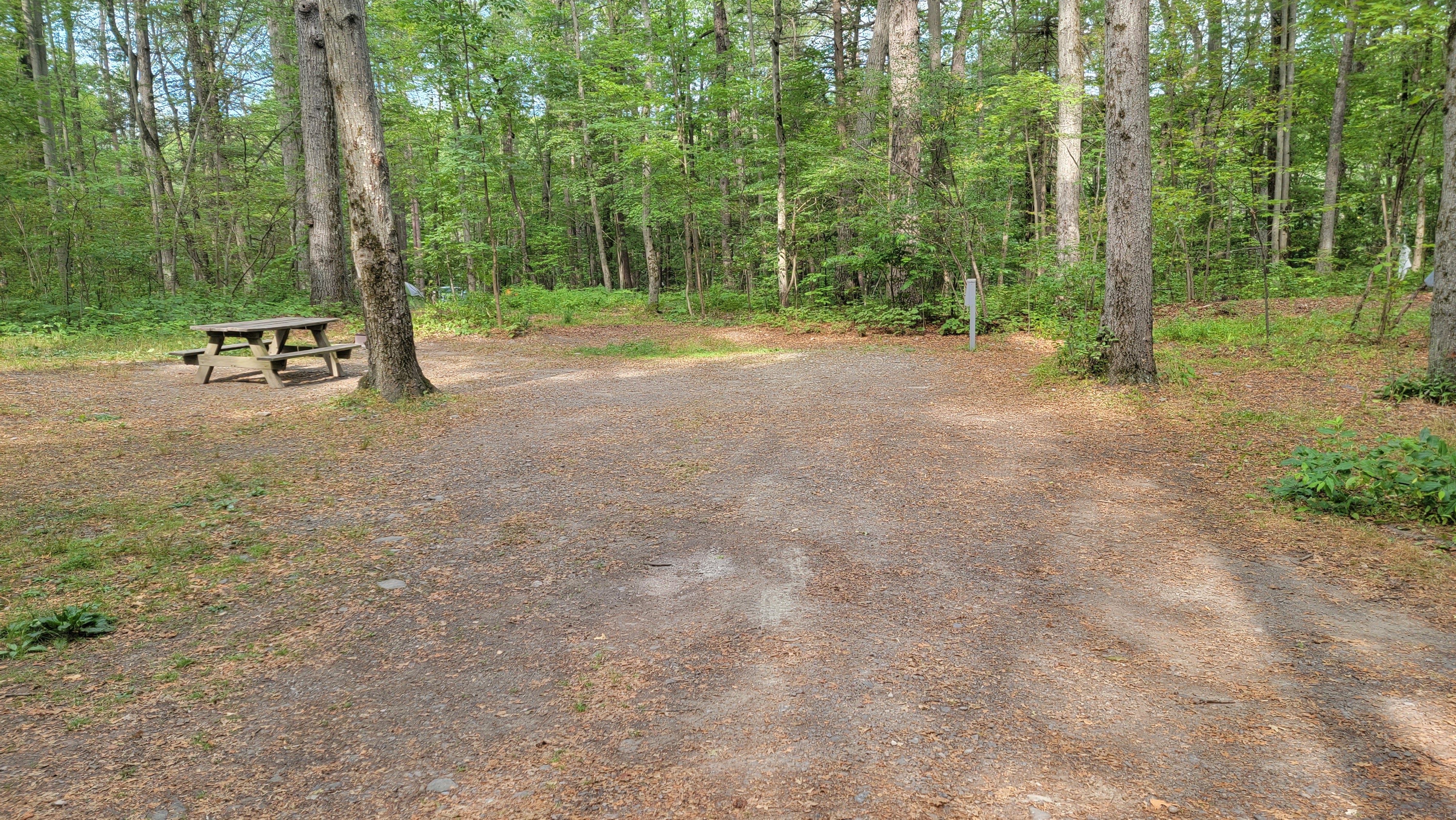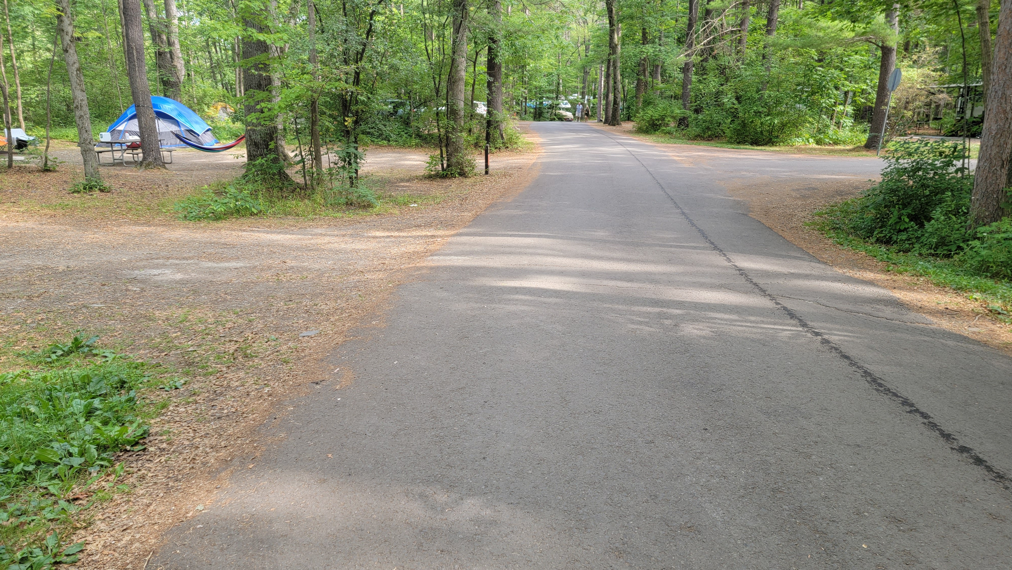 Campground Roadways: most are easily navigated especially those with electric sites (Cayuga and Mohawk). As you get further into the park the upper loops clearly have more tight turns, most are all used for tenting sites. There is a dump station in one of the loops which was in very good condition and easy access in and out. There are a few sites that back onto the large lawn area (group camping) on the left of the road where there is a large playground. I do not believe those open grass sites have any electricity so would be dry camping. These would be nice for families with children but they are pretty much in open sun. ALL other sites in this state park are in wooded, shady or partly shady areas. Nice for summer!