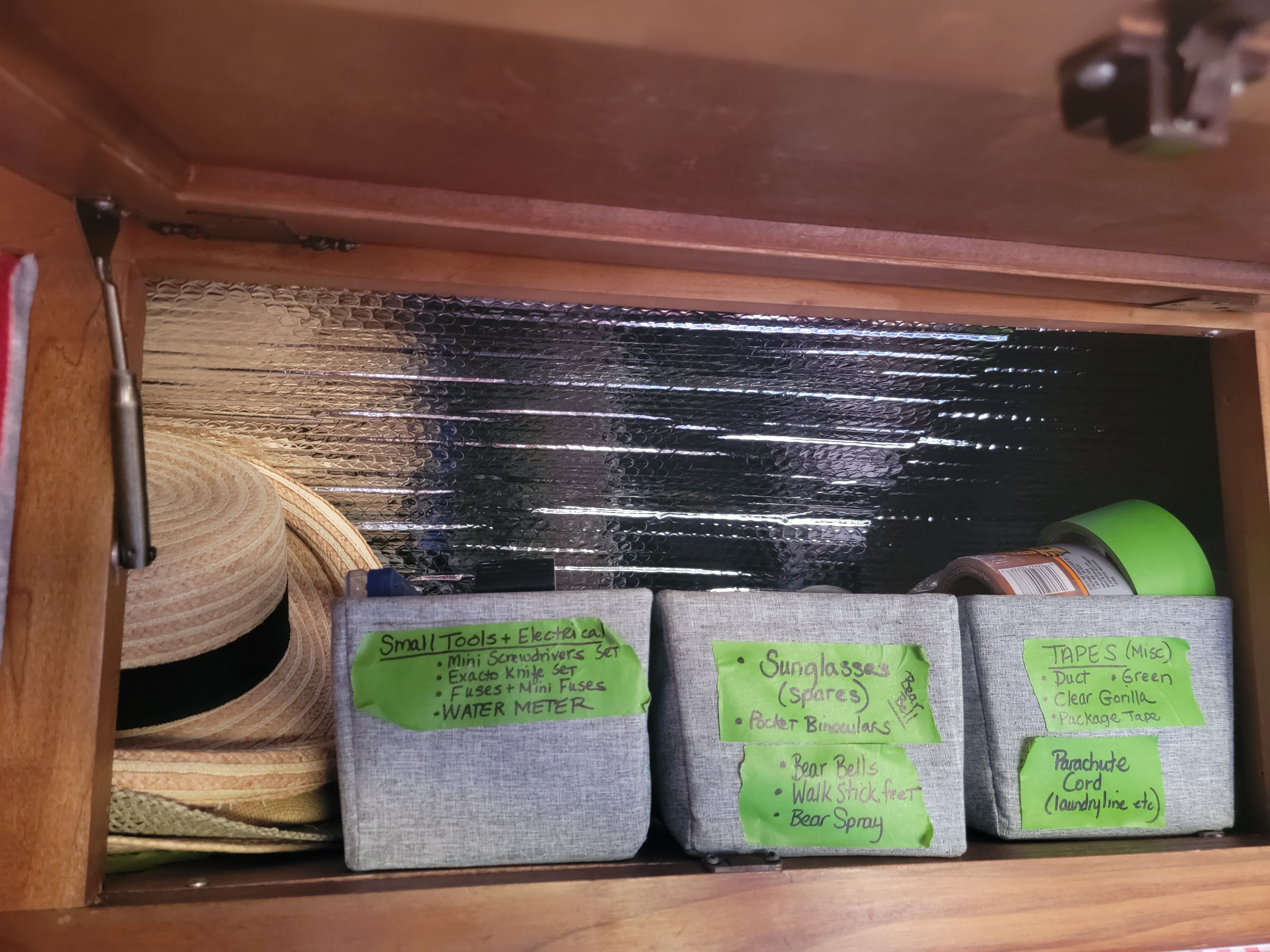 TIP! Below is what I have done to ensure that each of us put back items used back to where they “live” for future use. Labels have especially helped remind us both what goes where! I use easy to remove green painters tape on these fabric bins (with metal frames to with hold their shape well-from Bed Bath & Beyond) this way if contents or uses change, I can easily replace with new tape labels and the painters tape does not leave any residual stickiness (at least not yet!).