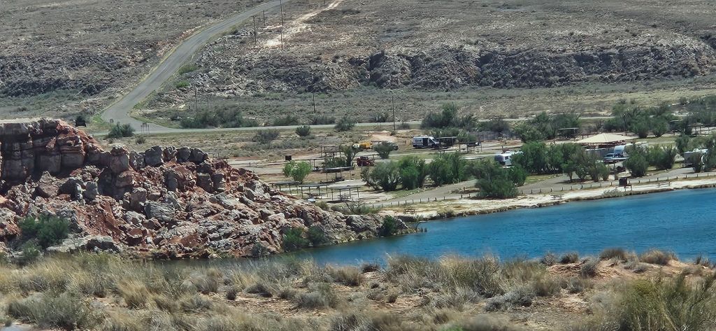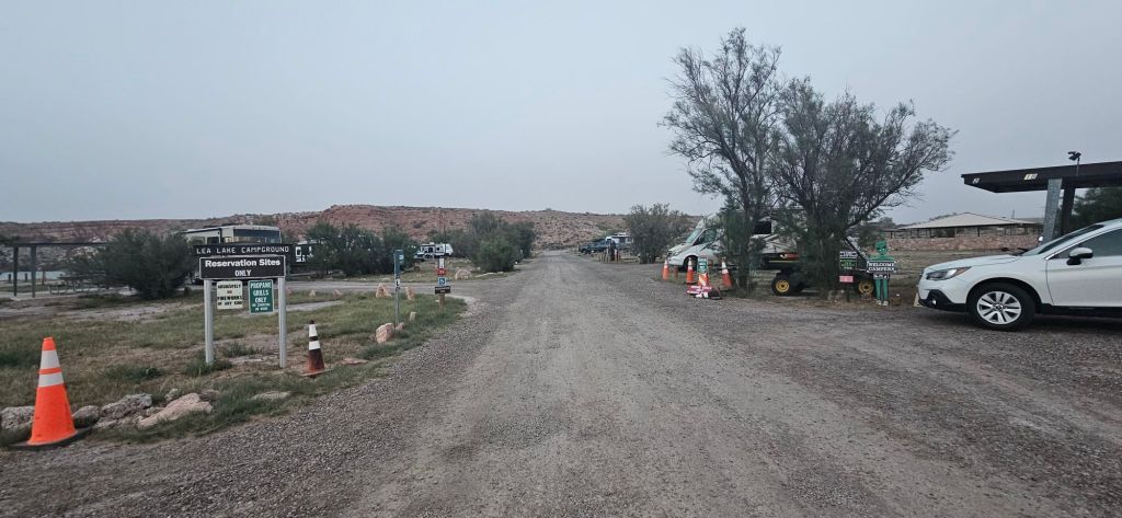 We are currently at Bottomless Lakes-Lea Lake Campground. A beautifully setting in a sinkhole gorge surrounded on one side by red rock cliffs. However the campground and the day use beach area clearly is tired. An entire loop in the campground right now is closed and undergoing upgrades to systems and sites. Sites are also FHU and some tenting sites. The day use and pavilion area is very close but looks a little tired. The beach needs a big infusion of beach sand for sure. We bet in hot summer months this place must be totally packed with locals to go swimming to cool off.