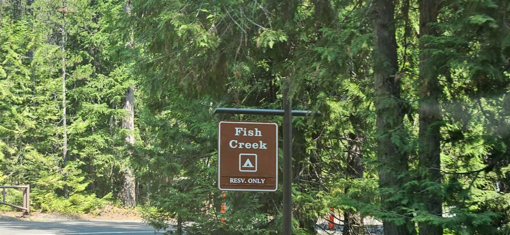 SITES AT FISH CREEK-Out of 180 sites we found 3, count ’em 3 that we felt would work for us at our 32 ft trailer length. Mind you, we sit high off the ground, and so in some cases, we factor in being able to back up over a low boulder, fire ring, or low bushes too. They are, for your reference; D148**, B92, and B 68, but in no way can we guarantee you would fit or like them.  ** means our 1st choice here.