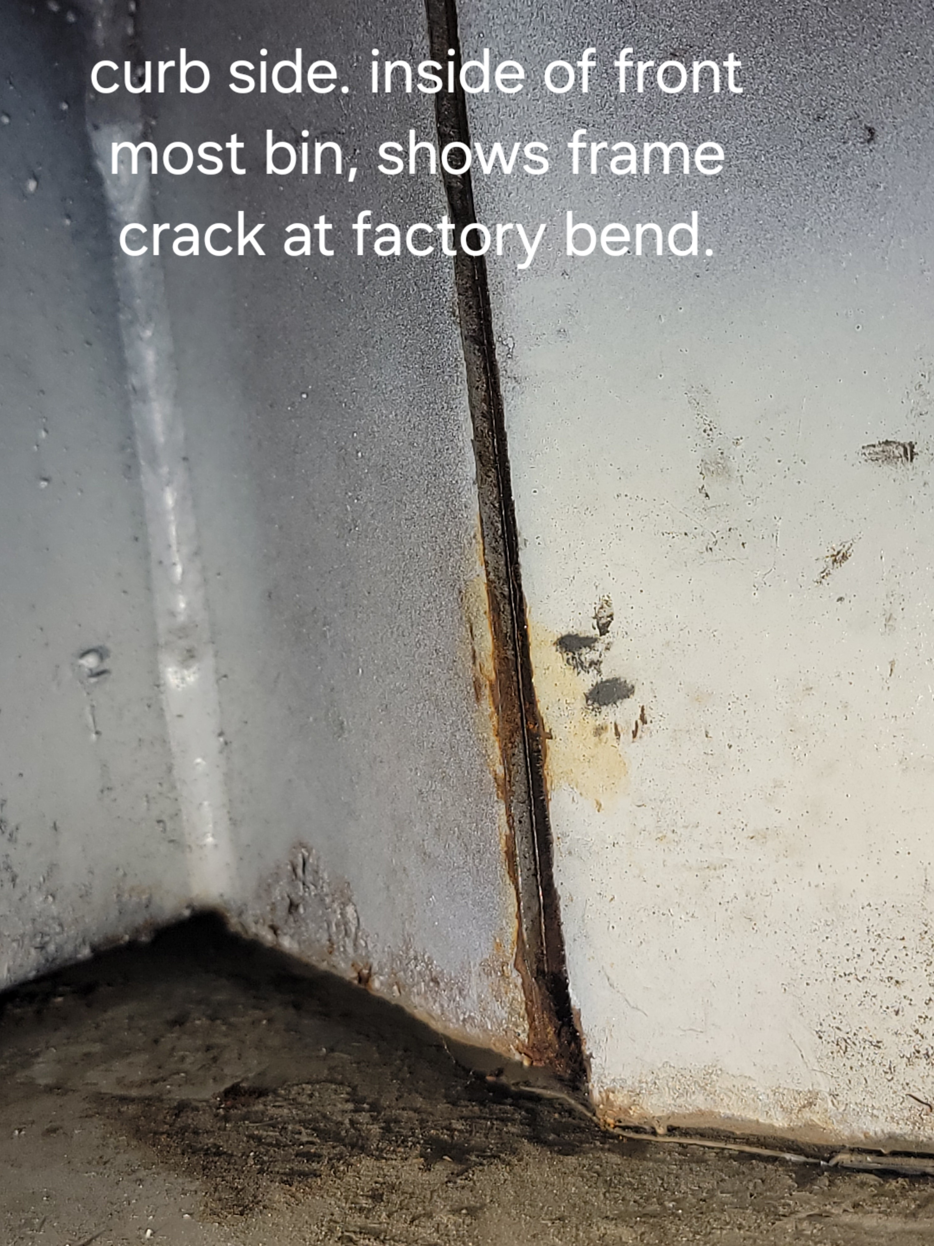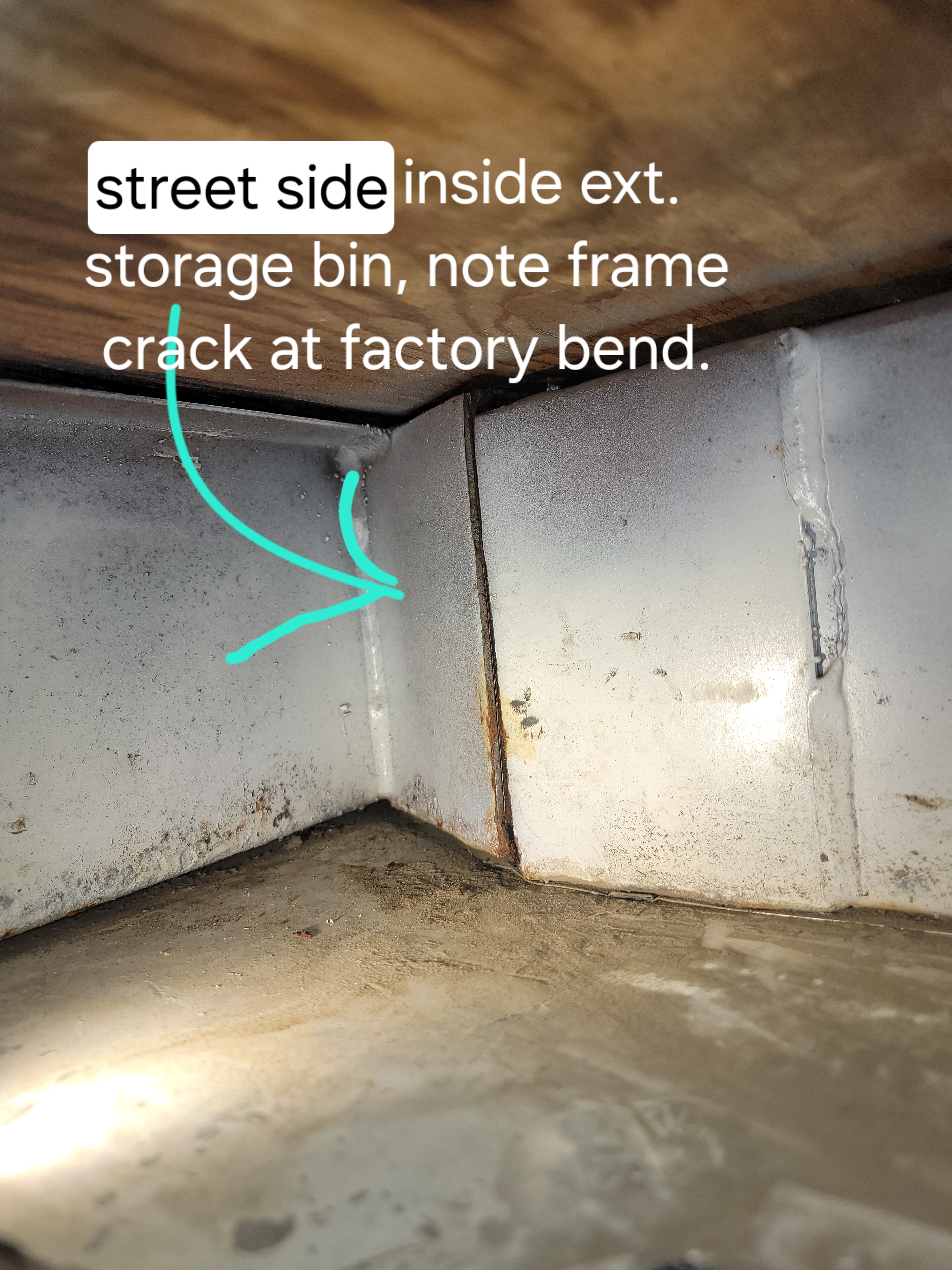 However, at this point in time (May 2024) he noticed the welded seam (the original) was showing a crack. This was seen on the curbside by looking in and to the front left corner of the basement storage bay by simply using a flashlight. On closer inspection, and after removing the belly pan in that area and crawling underneath to see the entire frame–there was also a break in the original plate and a break in it’s underlying weld. Here is a slide show showing photos of the weld and plate breaks. Use the arrow to scroll through to see both the curbside and street side frame breaks inside those front storage areas.