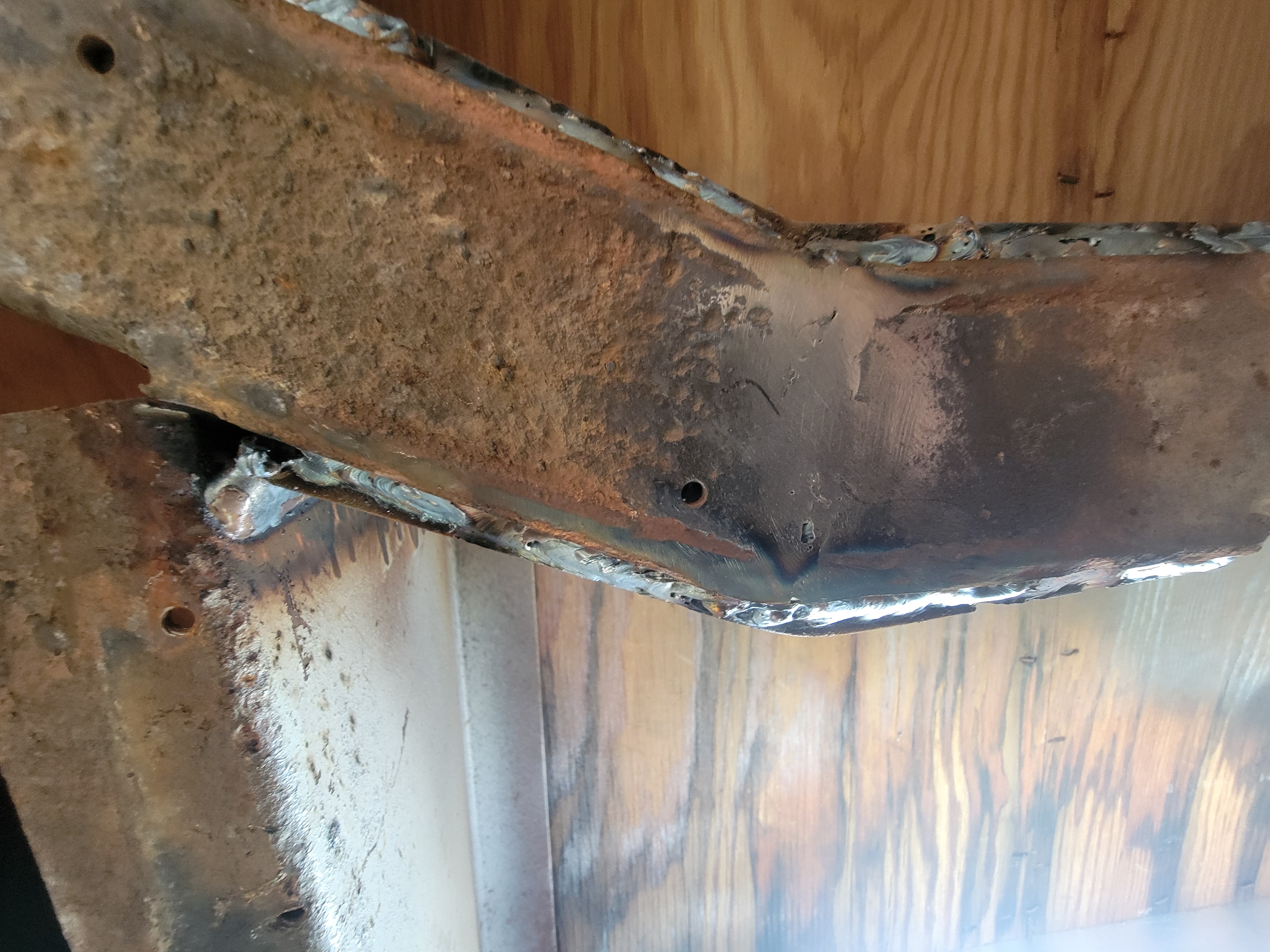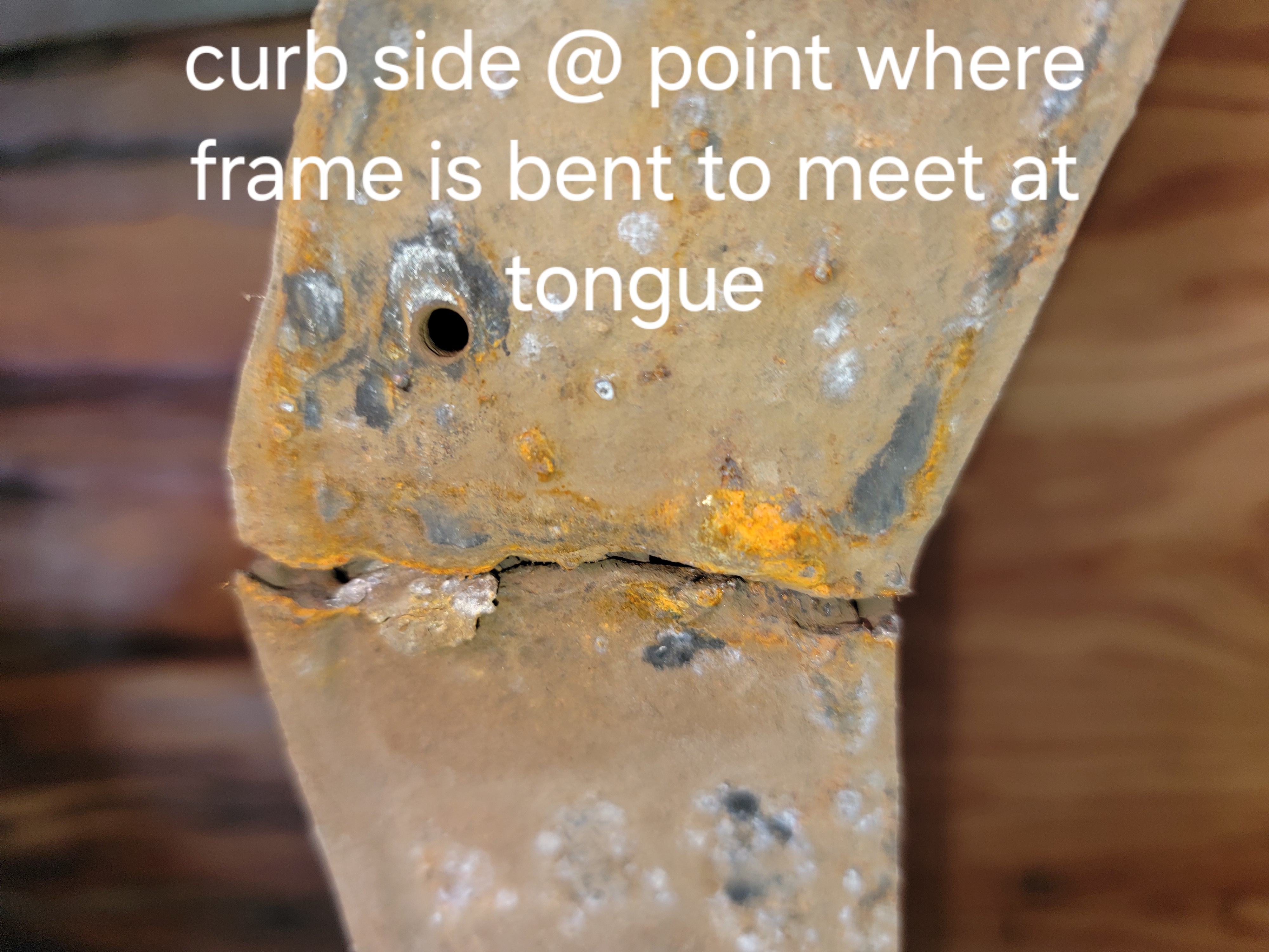 We called Chuck Cayo (Watervliet, MI) immediately (Avion repair guru we have used in the past with our ’73 and our ’87. Chuck’s dad worked with Avion’s and he is also the grandson of one of the original Avion manufacturers). Chuck confirmed that when these trailers were built they cut the straight steel side frame beams at that junction and welded it at an angle to bring that beam out to a V at the hitch coupler in front of the trailer. The seams were welded and plated there. (Refer to Avion frame photo at top of article) The two side beams meet up with the center beam and welded together and the hitch coupler then added on.