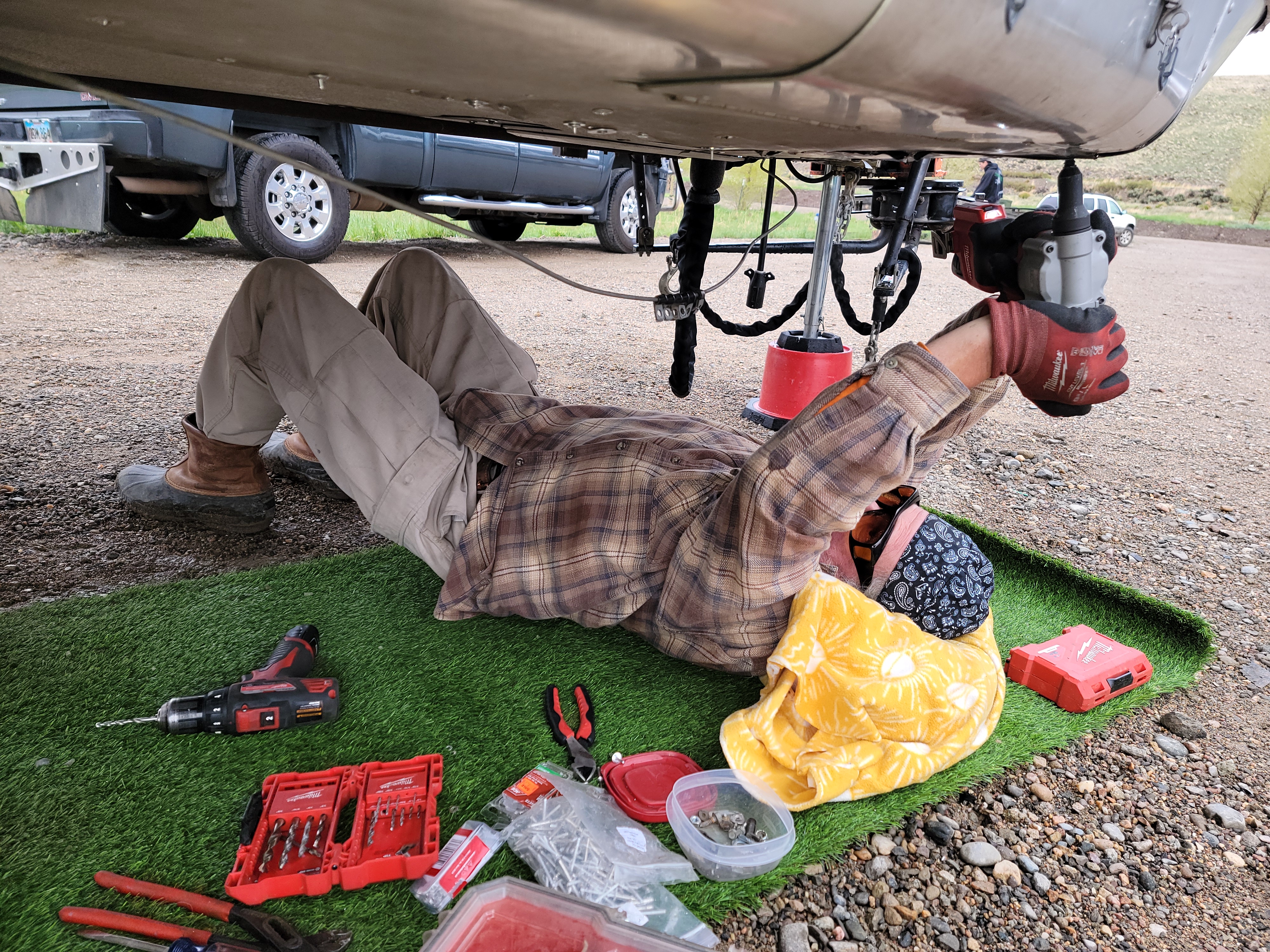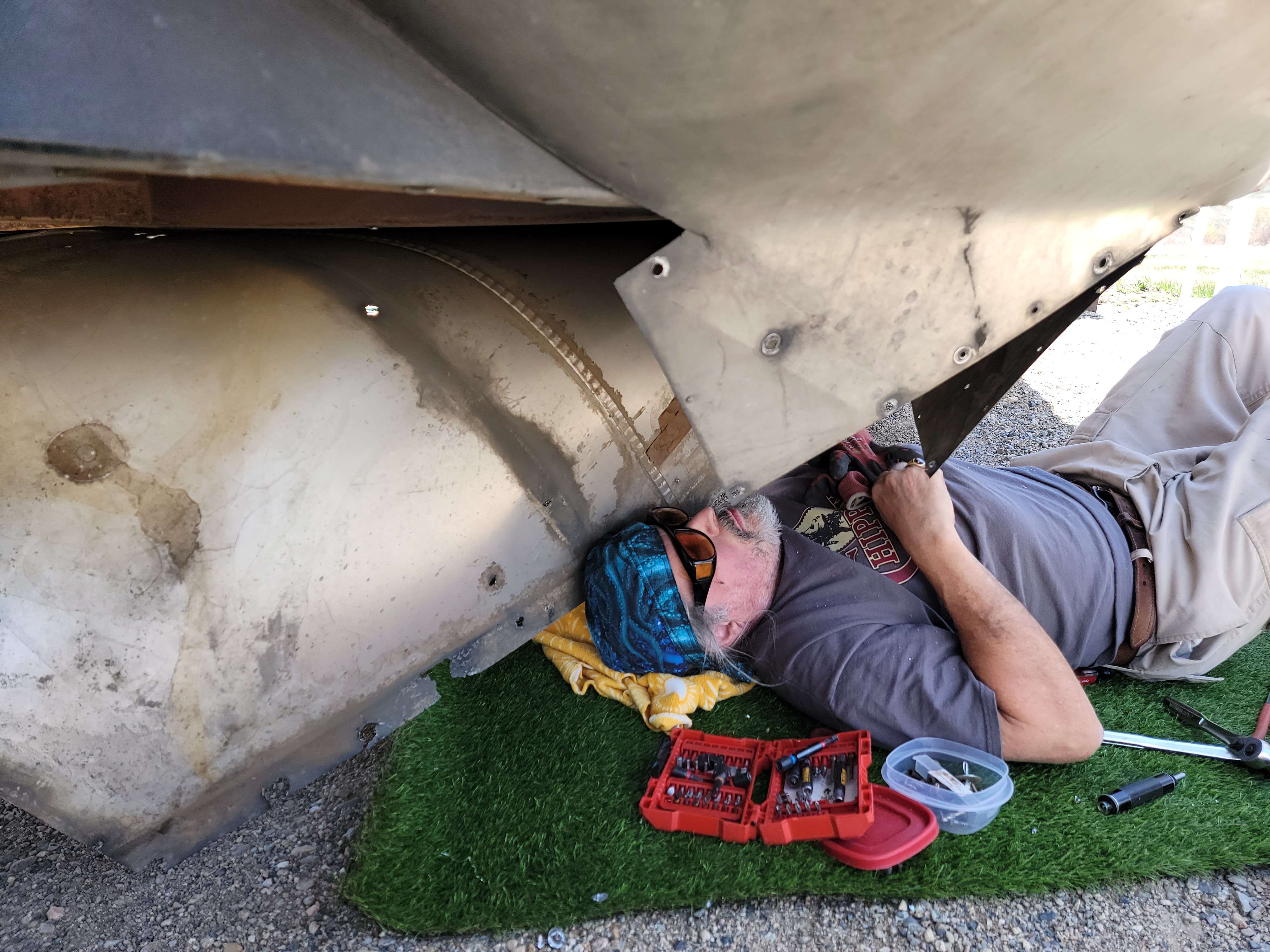 Here is a final photo of Kevin at the welding shop putting back in all the belly pan sheets after the repairs to the frame were done. The Pewter Palace is whole and running down the road to another adventure once more!