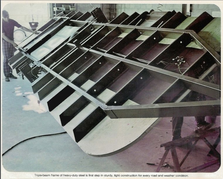 What truly saved us was the beefiness of Avion frames and it’s center beam construction! Most modern trailers do not use a center beam (see photo of an ’84 Avion frame below) **Note in the photo — below at the bottom left and top right you will see where the straight beam on each side, coming from the rear to front, then it takes a bend as it goes to the V of the hitch tongue area. See where there are welds and metal plates welded to secure those two areas. This is where our 1987, 32S Avion’s welds completely failed!