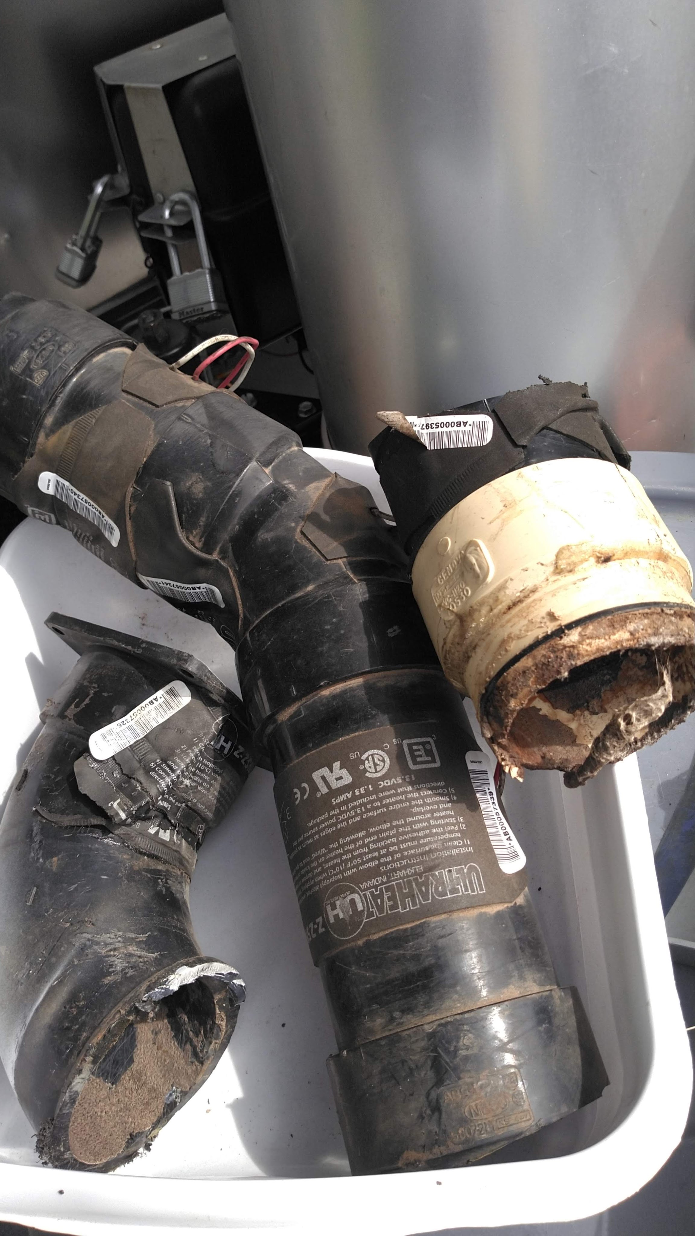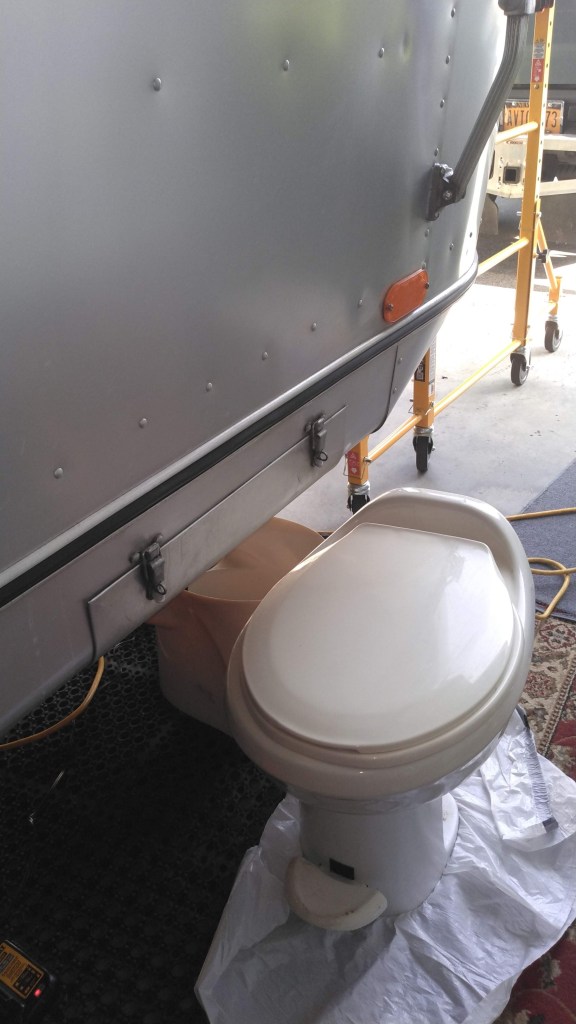 With both the toilet and vent stack disconnected, now its time to go back under your rig and remove the 3″ discharge pipe that takes sewage to your bayonet valve and to the sewer dump hose you connect when dumping your tanks. Ours was a twisty mess of several connections to get the right angle from the side discharge outlet of the tank to ultimately outside to the sewage valve bay area. Go easy as you may be able to salvage this piping completely and reuse. Unfortunately ours was really stuck on and we had to cut off the final elbow joint that fit through the sewerage bay area. Keep these parts to know what you need to buy should you need replacements when completing your new tank install.
