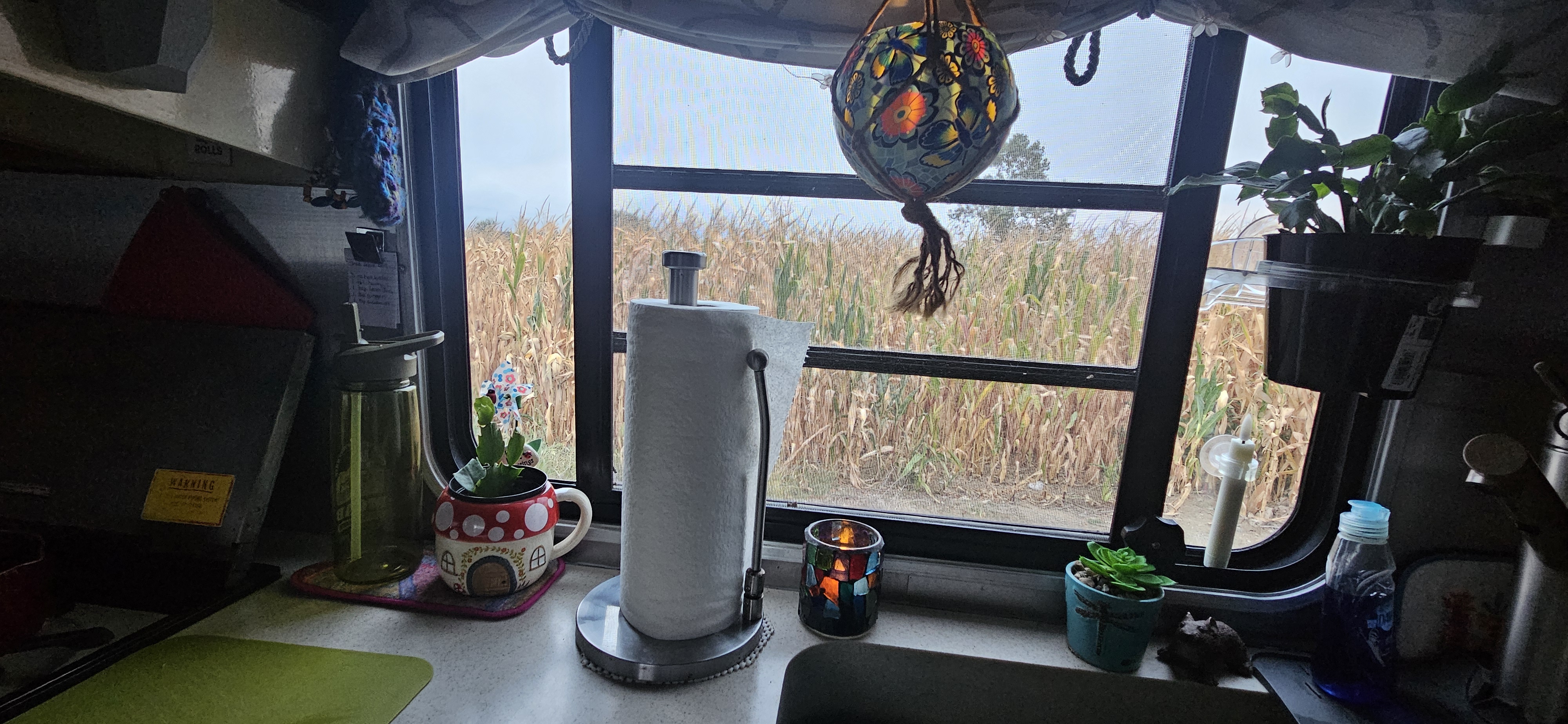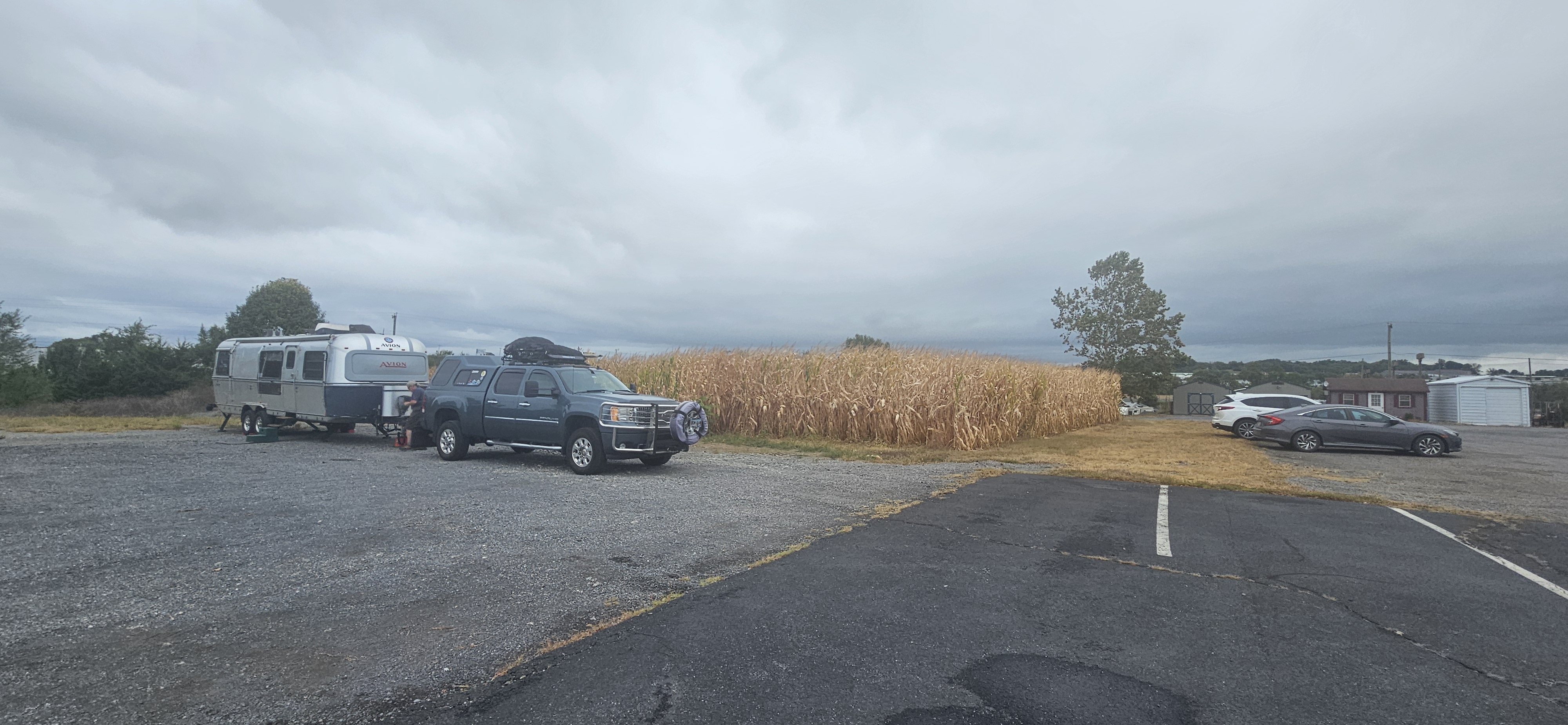 When we arrived about 3 pm we were the only overnight RVs in their dedicated “Harvest Host Guest Parking Area” and so we opted to park to the far right (east) side against the drying corn field. We knew it had just rained the day before so chances were good they would not be cutting the cornstalks down for silage just yet. However, be forwarned if you are parked there and the tractors start cutting we would NOT recommend parking there during cutting or you and your rig will be covered with silage dust and dirt. For us it was nice because it gave us total privacy on our street side. (