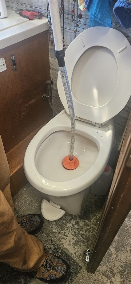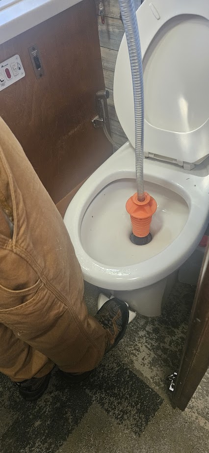 - Once you feel the lower black tank area has been sufficiently cleaned, carefully retract the wand end towards you to where it now is rinsing the straight pipe from the toilet bowl into the black tank. Go up and down at least sevetal times along the length of that pipe. It is good to pull the wand end with swirling water up and down a bit to get all areas of this pipe. Often, this is where TP will build up. We normally doing this tank and pipe rinsing for about 5 minutes total. IF you have another person to help, have them watch the clear end of your sewer pipe hook up to see if foul matter is still coming thru. If water looks clear of debris, you are done with the toilet part of the project. BE CAREFUL NOT TO ALLOW THE SPINNING WAND TIP TO COME OUT OF THE TOILET PIPE HOLE- or you and your entire bathroom will have a shower!
