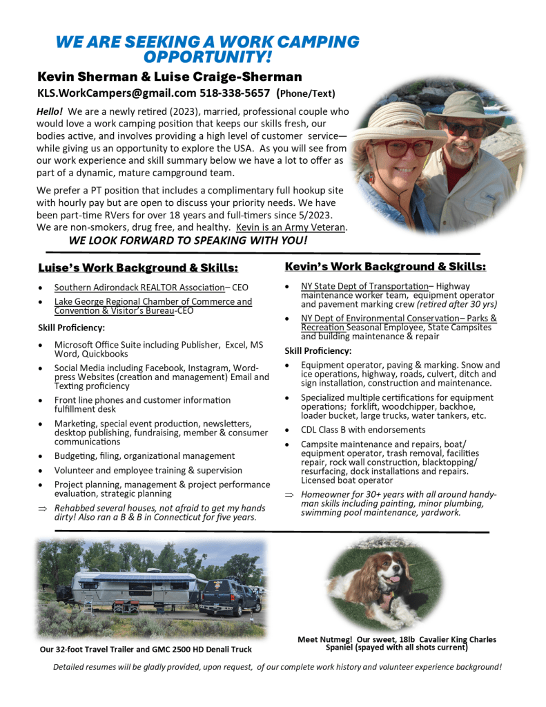 We have been RV-ing since 2006 and before that, tent camping for decades. We are new to work camping (having retired fully in 2023) and would appreciate the opportunity to provide work camping services (we are open to full or part-time) to augment your workforce and to provide optimal customer service and experiences for your guests.